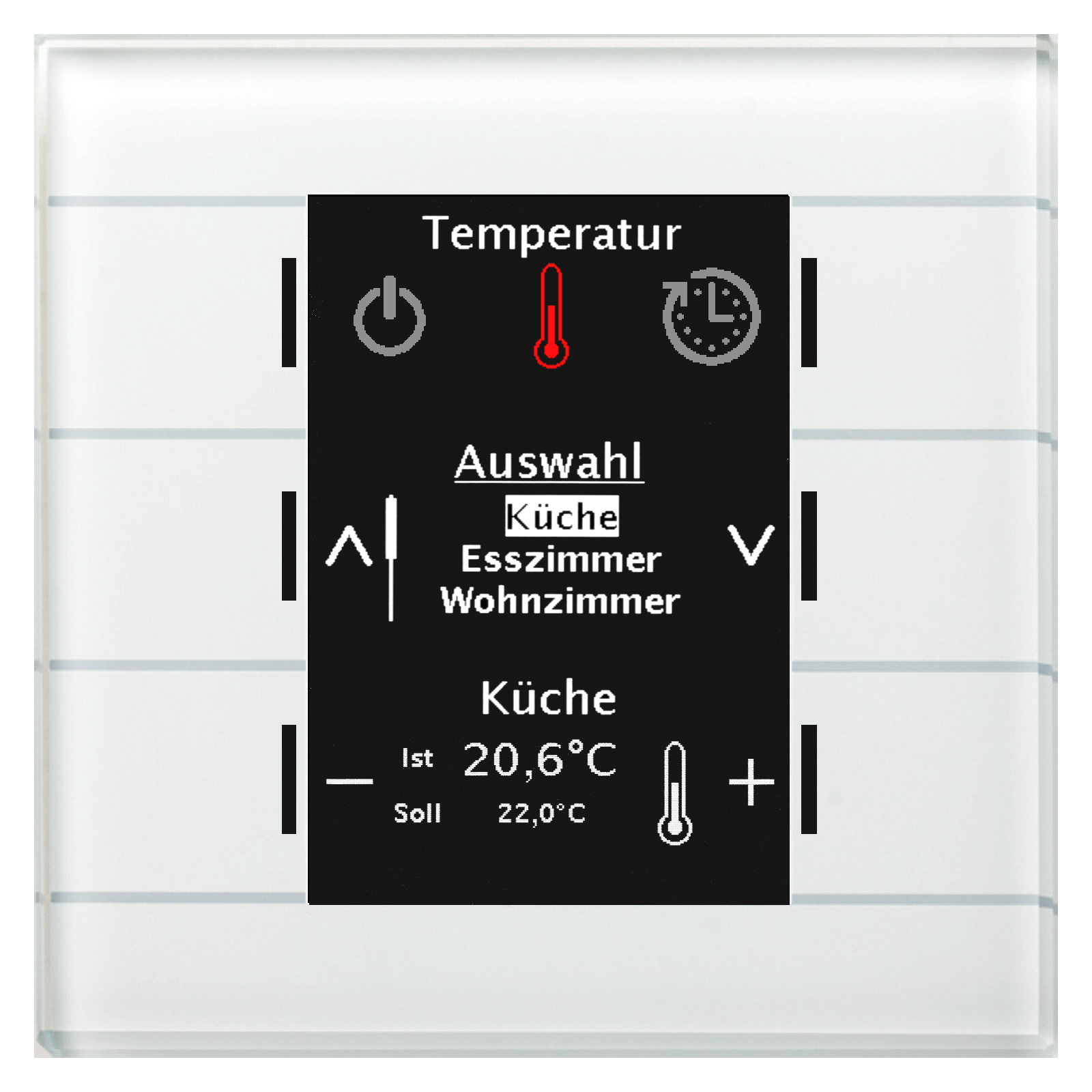Glas Bedienzentrale Smart mit Farbdisplay, Weiß. Ausführung mit 6 Sensorflächen. Integrierter Busankoppler. Großes, aktives Farbdisplay (automatische Helligkeitsanpassung). Vier Direktbedienfunktionen (z. B. Anwesend, Licht, Jalousie). 20 Bedienfunktionen über Menü/Schaltuhr (z.B. Dimmen/Jalousie/Schalten/Werte senden/Szenen/Temperatursollwerte). Codeschloss mit 4-6 Ziffern zur Gerätesperrung oder Alarm-Scharfschaltung. Tages-/Wochen-/Astro-Zeitschaltuhr (20 Kanäle mit je 6 Schaltzeiten). Urlaubsfunktion mit Zeitraumaktivierung. Automatische Feiertagsberechnung. Komfortabler Raumtemperaturregler mit Temperatursensor. Lüftungssteuerung (Hand oder Automatik). Anzeige von Innen-/Außentemperatur, Sollwert und Uhrzeit/Datum. Anzeige von Statusinformationen / Meldungen(1Bit)/(14Byte). 6 Status LEDs unabhängig ansteuerbar. 6 Logikblöcke mit je 4 Eingängen. Keine zusätzliche Spannungsversorgung erforderlich. Einbau in Schalterdose, Abmessungen (B x H): 92mm x 92mm. Empfohlene Montagehöhe 1,6m. 3 Jahre Produktgarantie.